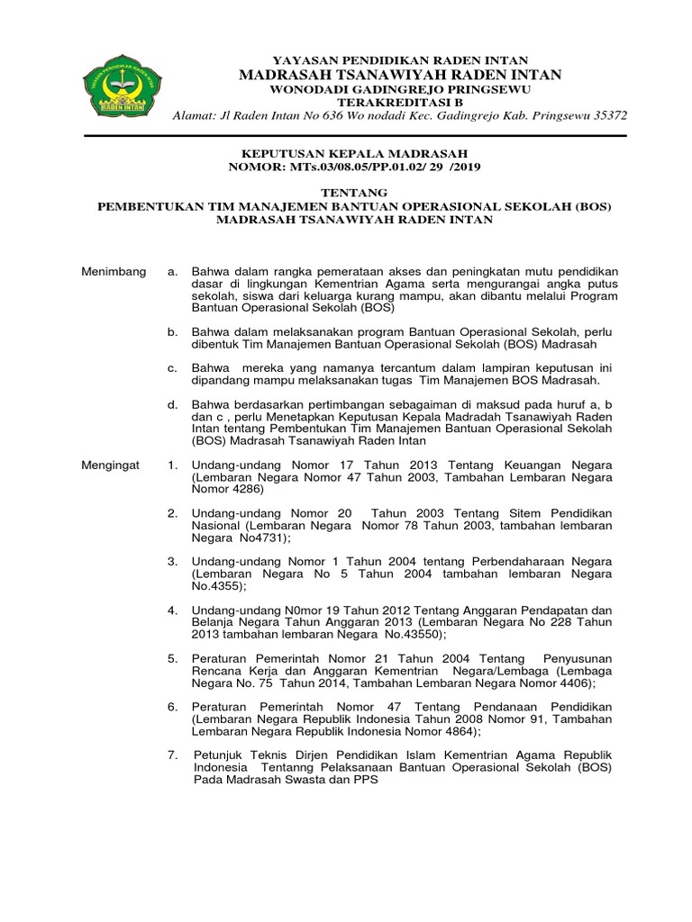 Surat keputusan ini menjadi dasar bagi personil yang tercantum di dalamnya untuk mengambil (mencairkan), mengelola, dan membuat laporan pertanggungjawaban penggunaan dana bos. Bahwa dalam rangka pemerataan akses dan peningkatan mutu pendidikan serta menekan angka putus sekolah, di lingkungan mi, mts dan ma penyelenggaraan wajar dikdas sembilan tahun, perlu dibantu. Bos madrasah, bos 2018, juknis bos 2018, contoh surat, sk bos, bos, bos sekolah, bos madrasah, bos 2018, sk pembentukan tim manajemen bos Contoh sk tim bos reguler sekolah terbaru 2021 (format word) untuk mengelola dana bos yang diterima lembaga, kepala sekolah wajib membuat sk tim bos. Tugas dan tanggungjawab tim manajemen bos kabkota dalam pengelolaan bos ma meliputi: